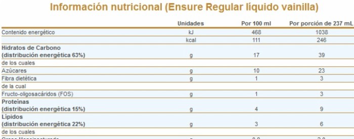 Te mostramos una tabla con todos los aportes . Compra en Internet Ensure Advance Menos Calorias X 2ml. Colombia con lo mejor de ENSURE en Bebidas. Composición: Ver Tabla Ensure no es para uso parenteral.